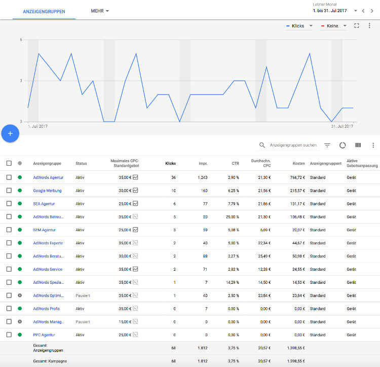In der äußeren linken Spalte am Rand lässt sich wie gehabt zwischen den einzelnen Kampagnen und Anzeigengruppen navigieren.